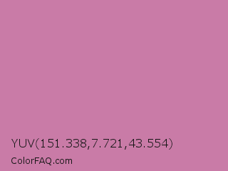 YUV 151.338,7.721,43.554 Color is a light magenta color and the nearest color is Sky Magenta #cf71af. Hex code #c97ba7 and RGB value is rgb(201,123,167). In RGB color space, this color is composed of 79% red, 48% green, 65% blue, In CMYK color space, this color is composed of 0% cyan, 39% magenta, 17% yellow , 21% black , In HSL color space, this color has a hue angle of 326° , 42% saturation and 64% lightness.
