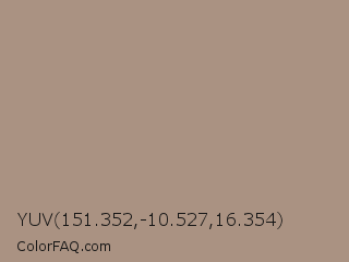YUV 151.352,-10.527,16.354 Color is a normal orange color and the nearest color is Sandrift #ab917a. Hex code #aa9282 and RGB value is rgb(170,146,130). In RGB color space, this color is composed of 67% red, 57% green, 51% blue, In CMYK color space, this color is composed of 0% cyan, 14% magenta, 24% yellow , 33% black , In HSL color space, this color has a hue angle of 24° , 19% saturation and 59% lightness.