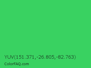 YUV 151.371,-26.805,-82.763 Color is a normal green color and the nearest color is UFO Green #3cd070. Hex code #39d261 and RGB value is rgb(57,210,97). In RGB color space, this color is composed of 22% red, 82% green, 38% blue, In CMYK color space, this color is composed of 73% cyan, 0% magenta, 54% yellow , 18% black , In HSL color space, this color has a hue angle of 136° , 63% saturation and 52% lightness.