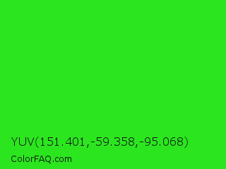 YUV 151.401,-59.358,-95.068 Color is a normal green color and the nearest color is Neon Green #39ff14. Hex code #2be61f and RGB value is rgb(43,230,31). In RGB color space, this color is composed of 17% red, 90% green, 12% blue, In CMYK color space, this color is composed of 81% cyan, 0% magenta, 87% yellow , 10% black , In HSL color space, this color has a hue angle of 116° , 80% saturation and 51% lightness.
