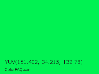 YUV 151.402,-34.215,-132.78 Color is a normal green color and the nearest color is Malachite #0bda51. Hex code #00f252 and RGB value is rgb(0,242,82). In RGB color space, this color is composed of 0% red, 95% green, 32% blue, In CMYK color space, this color is composed of 100% cyan, 0% magenta, 66% yellow , 5% black , In HSL color space, this color has a hue angle of 140° , 100% saturation and 47% lightness.