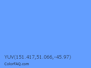 YUV 151.417,51.066,-45.97 Color is a light blue color and the nearest color is Cornflower Blue #6495ed. Hex code #639eff and RGB value is rgb(99,158,255). In RGB color space, this color is composed of 39% red, 62% green, 100% blue, In CMYK color space, this color is composed of 61% cyan, 38% magenta, 0% yellow , 0% black , In HSL color space, this color has a hue angle of 217° , 100% saturation and 69% lightness.
