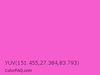 YUV 151.455,27.384,83.793 Color is a light magenta color and the nearest color is Light Deep Pink #ff5ccd. Hex code #f75ccf and RGB value is rgb(247,92,207). In RGB color space, this color is composed of 97% red, 36% green, 81% blue, In CMYK color space, this color is composed of 0% cyan, 63% magenta, 16% yellow , 3% black , In HSL color space, this color has a hue angle of 315° , 91% saturation and 66% lightness.