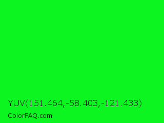 YUV 151.464,-58.403,-121.433 Color is a normal green color and the nearest color is Green #00ff00. Hex code #0df521 and RGB value is rgb(13,245,33). In RGB color space, this color is composed of 5% red, 96% green, 13% blue, In CMYK color space, this color is composed of 95% cyan, 0% magenta, 87% yellow , 4% black , In HSL color space, this color has a hue angle of 125° , 92% saturation and 51% lightness.