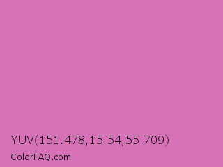 YUV 151.478,15.54,55.709 Color is a light magenta color and the nearest color is Sky Magenta #cf71af. Hex code #d771b7 and RGB value is rgb(215,113,183). In RGB color space, this color is composed of 84% red, 44% green, 72% blue, In CMYK color space, this color is composed of 0% cyan, 47% magenta, 15% yellow , 16% black , In HSL color space, this color has a hue angle of 319° , 56% saturation and 64% lightness.