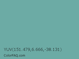 YUV 151.479,6.666,-38.131 Color is a normal cyan color and the nearest color is Green Sheen #6eaea1. Hex code #6caba5 and RGB value is rgb(108,171,165). In RGB color space, this color is composed of 42% red, 67% green, 65% blue, In CMYK color space, this color is composed of 37% cyan, 0% magenta, 4% yellow , 33% black , In HSL color space, this color has a hue angle of 174° , 27% saturation and 55% lightness.
