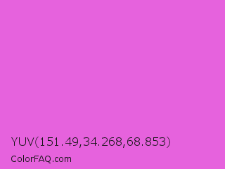 YUV 151.49,34.268,68.853 Color is a light magenta color and the nearest color is Orchid #da70d6. Hex code #e662dd and RGB value is rgb(230,98,221). In RGB color space, this color is composed of 90% red, 38% green, 87% blue, In CMYK color space, this color is composed of 0% cyan, 57% magenta, 4% yellow , 10% black , In HSL color space, this color has a hue angle of 304° , 73% saturation and 64% lightness.