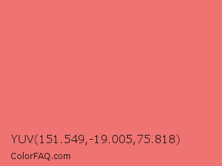 YUV 151.549,-19.005,75.818 Color is a light red color and the nearest color is Candy Pink #e4717a. Hex code #ee7371 and RGB value is rgb(238,115,113). In RGB color space, this color is composed of 93% red, 45% green, 44% blue, In CMYK color space, this color is composed of 0% cyan, 52% magenta, 53% yellow , 7% black , In HSL color space, this color has a hue angle of 1° , 79% saturation and 69% lightness.