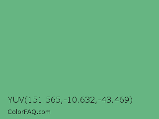 YUV 151.565,-10.632,-43.469 Color is a normal green color and the nearest color is Silver Tree #66b58f. Hex code #66b582 and RGB value is rgb(102,181,130). In RGB color space, this color is composed of 40% red, 71% green, 51% blue, In CMYK color space, this color is composed of 44% cyan, 0% magenta, 28% yellow , 29% black , In HSL color space, this color has a hue angle of 141° , 35% saturation and 55% lightness.