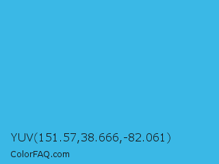 YUV 151.57,38.666,-82.061 Color is a normal blue color and the nearest color is Picton Blue #45b1e8. Hex code #3ab8e6 and RGB value is rgb(58,184,230). In RGB color space, this color is composed of 23% red, 72% green, 90% blue, In CMYK color space, this color is composed of 75% cyan, 20% magenta, 0% yellow , 10% black , In HSL color space, this color has a hue angle of 196° , 77% saturation and 56% lightness.