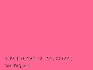YUV 151.589,-2.755,90.691 Color is a light rose color and the nearest color is Light Crimson #f56991. Hex code #ff6492 and RGB value is rgb(255,100,146). In RGB color space, this color is composed of 100% red, 39% green, 57% blue, In CMYK color space, this color is composed of 0% cyan, 61% magenta, 43% yellow , 0% black , In HSL color space, this color has a hue angle of 342° , 100% saturation and 70% lightness.
