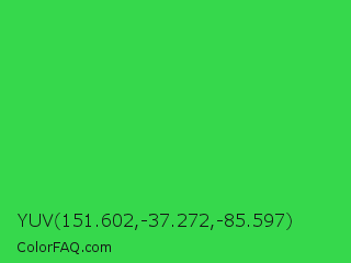YUV 151.602,-37.272,-85.597 Color is a normal green color and the nearest color is Lime Green #32cd32. Hex code #36d84c and RGB value is rgb(54,216,76). In RGB color space, this color is composed of 21% red, 85% green, 30% blue, In CMYK color space, this color is composed of 75% cyan, 0% magenta, 65% yellow , 15% black , In HSL color space, this color has a hue angle of 128° , 68% saturation and 53% lightness.