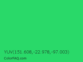 YUV 151.608,-22.978,-97.003 Color is a normal green color and the nearest color is UFO Green #3cd070. Hex code #29d969 and RGB value is rgb(41,217,105). In RGB color space, this color is composed of 16% red, 85% green, 41% blue, In CMYK color space, this color is composed of 81% cyan, 0% magenta, 52% yellow , 15% black , In HSL color space, this color has a hue angle of 142° , 70% saturation and 51% lightness.