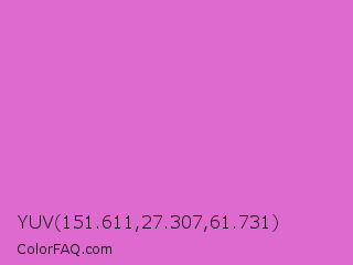 YUV 151.611,27.307,61.731 Color is a light magenta color and the nearest color is Orchid #da70d6. Hex code #de69cf and RGB value is rgb(222,105,207). In RGB color space, this color is composed of 87% red, 41% green, 81% blue, In CMYK color space, this color is composed of 0% cyan, 53% magenta, 7% yellow , 13% black , In HSL color space, this color has a hue angle of 308° , 64% saturation and 64% lightness.
