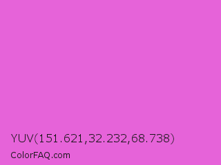 YUV 151.621,32.232,68.738 Color is a light magenta color and the nearest color is Orchid #da70d6. Hex code #e663d9 and RGB value is rgb(230,99,217). In RGB color space, this color is composed of 90% red, 39% green, 85% blue, In CMYK color space, this color is composed of 0% cyan, 57% magenta, 6% yellow , 10% black , In HSL color space, this color has a hue angle of 306° , 72% saturation and 65% lightness.