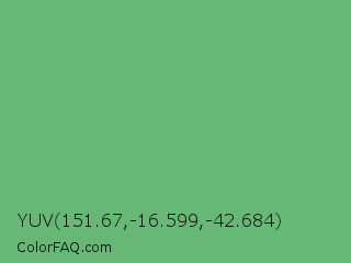 YUV 151.67,-16.599,-42.684 Color is a normal green color and the nearest color is Fern #63b76c. Hex code #67b776 and RGB value is rgb(103,183,118). In RGB color space, this color is composed of 40% red, 72% green, 46% blue, In CMYK color space, this color is composed of 44% cyan, 0% magenta, 36% yellow , 28% black , In HSL color space, this color has a hue angle of 131° , 36% saturation and 56% lightness.