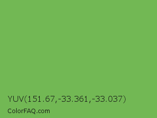 YUV 151.67,-33.361,-33.037 Color is a normal green color and the nearest color is Bud Green #7bb661. Hex code #72b854 and RGB value is rgb(114,184,84). In RGB color space, this color is composed of 45% red, 72% green, 33% blue, In CMYK color space, this color is composed of 38% cyan, 0% magenta, 54% yellow , 28% black , In HSL color space, this color has a hue angle of 102° , 41% saturation and 53% lightness.