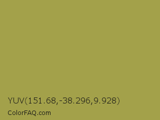 YUV 151.68,-38.296,9.928 Color is a normal yellow color and the nearest color is Brass #b5a642. Hex code #a3a14a and RGB value is rgb(163,161,74). In RGB color space, this color is composed of 64% red, 63% green, 29% blue, In CMYK color space, this color is composed of 0% cyan, 1% magenta, 55% yellow , 36% black , In HSL color space, this color has a hue angle of 59° , 38% saturation and 46% lightness.