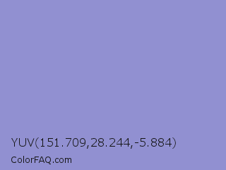 YUV 151.709,28.244,-5.884 Color is a light indigo color and the nearest color is Blue Bell Crayola #9999cc. Hex code #9190d1 and RGB value is rgb(145,144,209). In RGB color space, this color is composed of 57% red, 56% green, 82% blue, In CMYK color space, this color is composed of 31% cyan, 31% magenta, 0% yellow , 18% black , In HSL color space, this color has a hue angle of 241° , 41% saturation and 69% lightness.