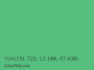 YUV 151.722,-12.188,-57.638 Color is a normal green color and the nearest color is Emerald #50c878. Hex code #56be7f and RGB value is rgb(86,190,127). In RGB color space, this color is composed of 34% red, 75% green, 50% blue, In CMYK color space, this color is composed of 55% cyan, 0% magenta, 33% yellow , 25% black , In HSL color space, this color has a hue angle of 144° , 44% saturation and 54% lightness.