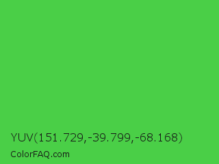 YUV 151.729,-39.799,-68.168 Color is a normal green color and the nearest color is Lime Green #32cd32. Hex code #4acf47 and RGB value is rgb(74,207,71). In RGB color space, this color is composed of 29% red, 81% green, 28% blue, In CMYK color space, this color is composed of 64% cyan, 0% magenta, 66% yellow , 19% black , In HSL color space, this color has a hue angle of 119° , 59% saturation and 55% lightness.