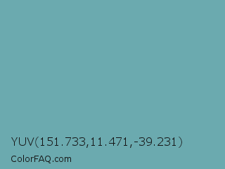 YUV 151.733,11.471,-39.231 Color is a normal cyan color and the nearest color is Green Sheen #6eaea1. Hex code #6baaaf and RGB value is rgb(107,170,175). In RGB color space, this color is composed of 42% red, 67% green, 69% blue, In CMYK color space, this color is composed of 39% cyan, 3% magenta, 0% yellow , 31% black , In HSL color space, this color has a hue angle of 184° , 30% saturation and 55% lightness.