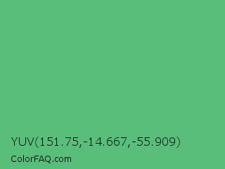 YUV 151.75,-14.667,-55.909 Color is a normal green color and the nearest color is Emerald #50c878. Hex code #58be7a and RGB value is rgb(88,190,122). In RGB color space, this color is composed of 35% red, 75% green, 48% blue, In CMYK color space, this color is composed of 54% cyan, 0% magenta, 36% yellow , 25% black , In HSL color space, this color has a hue angle of 140° , 44% saturation and 55% lightness.