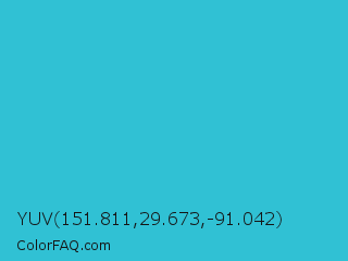 YUV 151.811,29.673,-91.042 Color is a normal cyan color and the nearest color is Scooter #2ebfd4. Hex code #30c1d4 and RGB value is rgb(48,193,212). In RGB color space, this color is composed of 19% red, 76% green, 83% blue, In CMYK color space, this color is composed of 77% cyan, 9% magenta, 0% yellow , 17% black , In HSL color space, this color has a hue angle of 187° , 66% saturation and 51% lightness.