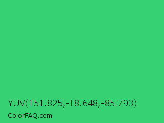 YUV 151.825,-18.648,-85.793 Color is a normal green color and the nearest color is UFO Green #3cd070. Hex code #36d172 and RGB value is rgb(54,209,114). In RGB color space, this color is composed of 21% red, 82% green, 45% blue, In CMYK color space, this color is composed of 74% cyan, 0% magenta, 45% yellow , 18% black , In HSL color space, this color has a hue angle of 143° , 63% saturation and 52% lightness.