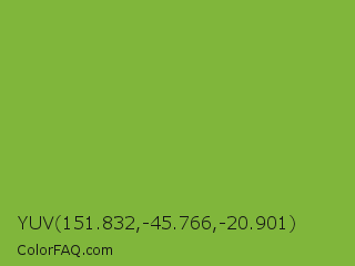 YUV 151.832,-45.766,-20.901 Color is a normal green color and the nearest color is Sushi #87ab39. Hex code #80b63b and RGB value is rgb(128,182,59). In RGB color space, this color is composed of 50% red, 71% green, 23% blue, In CMYK color space, this color is composed of 30% cyan, 0% magenta, 68% yellow , 29% black , In HSL color space, this color has a hue angle of 86° , 51% saturation and 47% lightness.