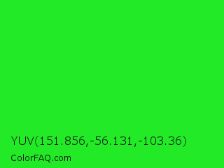 YUV 151.856,-56.131,-103.36 Color is a normal green color and the nearest color is Lime Green #32cd32. Hex code #22ea26 and RGB value is rgb(34,234,38). In RGB color space, this color is composed of 13% red, 92% green, 15% blue, In CMYK color space, this color is composed of 85% cyan, 0% magenta, 84% yellow , 8% black , In HSL color space, this color has a hue angle of 121° , 83% saturation and 53% lightness.