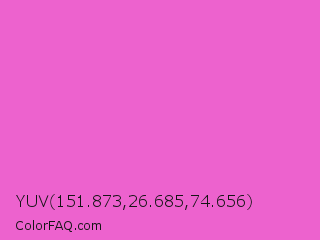 YUV 151.873,26.685,74.656 Color is a light magenta color and the nearest color is Rose Pink #ff66cc. Hex code #ed62ce and RGB value is rgb(237,98,206). In RGB color space, this color is composed of 93% red, 38% green, 81% blue, In CMYK color space, this color is composed of 0% cyan, 59% magenta, 13% yellow , 7% black , In HSL color space, this color has a hue angle of 313° , 79% saturation and 66% lightness.