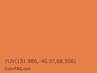 YUV 151.886,-40.37,68.506 Color is a normal orange color and the nearest color is Jaffa #ef863f. Hex code #e68046 and RGB value is rgb(230,128,70). In RGB color space, this color is composed of 90% red, 50% green, 27% blue, In CMYK color space, this color is composed of 0% cyan, 44% magenta, 70% yellow , 10% black , In HSL color space, this color has a hue angle of 22° , 76% saturation and 59% lightness.
