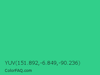 YUV 151.892,-6.849,-90.236 Color is a normal green color and the nearest color is Shamrock #33cc99. Hex code #31cf8a and RGB value is rgb(49,207,138). In RGB color space, this color is composed of 19% red, 81% green, 54% blue, In CMYK color space, this color is composed of 76% cyan, 0% magenta, 33% yellow , 19% black , In HSL color space, this color has a hue angle of 154° , 62% saturation and 50% lightness.