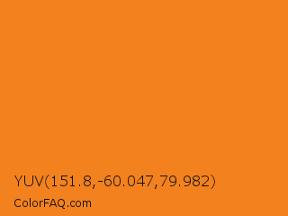 YUV 151.8,-60.047,79.982 Color is a normal orange color and the nearest color is Princeton Orange #f58025. Hex code #f3811e and RGB value is rgb(243,129,30). In RGB color space, this color is composed of 95% red, 51% green, 12% blue, In CMYK color space, this color is composed of 0% cyan, 47% magenta, 88% yellow , 5% black , In HSL color space, this color has a hue angle of 28° , 90% saturation and 54% lightness.