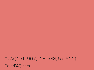 YUV 151.907,-18.688,67.611 Color is a light red color and the nearest color is Candy Pink #e4717a. Hex code #e57872 and RGB value is rgb(229,120,114). In RGB color space, this color is composed of 90% red, 47% green, 45% blue, In CMYK color space, this color is composed of 0% cyan, 48% magenta, 50% yellow , 10% black , In HSL color space, this color has a hue angle of 3° , 69% saturation and 67% lightness.