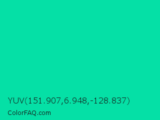 YUV 151.907,6.948,-128.837 Color is a normal cyan color and the nearest color is Caribbean Green #00cc99. Hex code #05e0a6 and RGB value is rgb(5,224,166). In RGB color space, this color is composed of 2% red, 88% green, 65% blue, In CMYK color space, this color is composed of 98% cyan, 0% magenta, 26% yellow , 12% black , In HSL color space, this color has a hue angle of 164° , 96% saturation and 45% lightness.