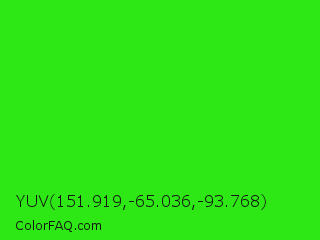 YUV 151.919,-65.036,-93.768 Color is a normal green color and the nearest color is Neon Green #39ff14. Hex code #2de814 and RGB value is rgb(45,232,20). In RGB color space, this color is composed of 18% red, 91% green, 8% blue, In CMYK color space, this color is composed of 81% cyan, 0% magenta, 91% yellow , 9% black , In HSL color space, this color has a hue angle of 113° , 84% saturation and 49% lightness.