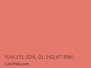 YUV 151.924,-21.162,67.596 Color is a light red color and the nearest color is Candy Pink #e4717a. Hex code #e5796d and RGB value is rgb(229,121,109). In RGB color space, this color is composed of 90% red, 47% green, 43% blue, In CMYK color space, this color is composed of 0% cyan, 47% magenta, 52% yellow , 10% black , In HSL color space, this color has a hue angle of 6° , 70% saturation and 66% lightness.