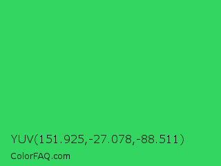 YUV 151.925,-27.078,-88.511 Color is a normal green color and the nearest color is UFO Green #3cd070. Hex code #33d661 and RGB value is rgb(51,214,97). In RGB color space, this color is composed of 20% red, 84% green, 38% blue, In CMYK color space, this color is composed of 76% cyan, 0% magenta, 55% yellow , 16% black , In HSL color space, this color has a hue angle of 137° , 67% saturation and 52% lightness.
