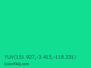 YUV 151.927,-3.415,-118.331 Color is a normal green color and the nearest color is Caribbean Green #00cc99. Hex code #11de91 and RGB value is rgb(17,222,145). In RGB color space, this color is composed of 7% red, 87% green, 57% blue, In CMYK color space, this color is composed of 92% cyan, 0% magenta, 35% yellow , 13% black , In HSL color space, this color has a hue angle of 157° , 86% saturation and 47% lightness.