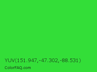 YUV 151.947,-47.302,-88.531 Color is a normal green color and the nearest color is Lime Green #32cd32. Hex code #33de38 and RGB value is rgb(51,222,56). In RGB color space, this color is composed of 20% red, 87% green, 22% blue, In CMYK color space, this color is composed of 77% cyan, 0% magenta, 75% yellow , 13% black , In HSL color space, this color has a hue angle of 122° , 72% saturation and 54% lightness.