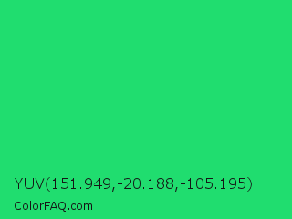 YUV 151.949,-20.188,-105.195 Color is a normal green color and the nearest color is UFO Green #3cd070. Hex code #20dd6f and RGB value is rgb(32,221,111). In RGB color space, this color is composed of 13% red, 87% green, 44% blue, In CMYK color space, this color is composed of 86% cyan, 0% magenta, 50% yellow , 13% black , In HSL color space, this color has a hue angle of 145° , 75% saturation and 50% lightness.