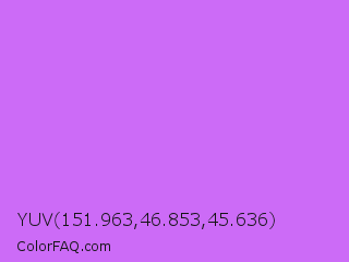 YUV 151.963,46.853,45.636 Color is a light purple color and the nearest color is Heliotrope #df73ff. Hex code #cc6bf7 and RGB value is rgb(204,107,247). In RGB color space, this color is composed of 80% red, 42% green, 97% blue, In CMYK color space, this color is composed of 17% cyan, 57% magenta, 0% yellow , 3% black , In HSL color space, this color has a hue angle of 282° , 90% saturation and 69% lightness.