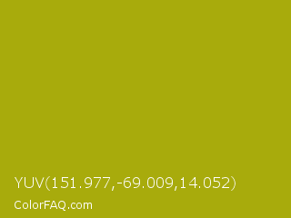 YUV 151.977,-69.009,14.052 Color is a normal yellow color and the nearest color is Sahara #b7a214. Hex code #a8ab0c and RGB value is rgb(168,171,12). In RGB color space, this color is composed of 66% red, 67% green, 5% blue, In CMYK color space, this color is composed of 2% cyan, 0% magenta, 93% yellow , 33% black , In HSL color space, this color has a hue angle of 61° , 87% saturation and 36% lightness.