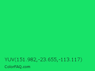 YUV 151.982,-23.655,-113.117 Color is a normal green color and the nearest color is Malachite #0bda51. Hex code #17e368 and RGB value is rgb(23,227,104). In RGB color space, this color is composed of 9% red, 89% green, 41% blue, In CMYK color space, this color is composed of 90% cyan, 0% magenta, 54% yellow , 11% black , In HSL color space, this color has a hue angle of 144° , 82% saturation and 49% lightness.