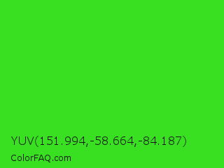 YUV 151.994,-58.664,-84.187 Color is a normal green color and the nearest color is Lime Green #32cd32. Hex code #38e021 and RGB value is rgb(56,224,33). In RGB color space, this color is composed of 22% red, 88% green, 13% blue, In CMYK color space, this color is composed of 75% cyan, 0% magenta, 85% yellow , 12% black , In HSL color space, this color has a hue angle of 113° , 75% saturation and 50% lightness.