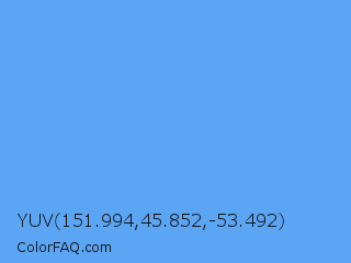 YUV 151.994,45.852,-53.492 Color is a light blue color and the nearest color is Blue Jeans #5dadec. Hex code #5ba5f5 and RGB value is rgb(91,165,245). In RGB color space, this color is composed of 36% red, 65% green, 96% blue, In CMYK color space, this color is composed of 63% cyan, 33% magenta, 0% yellow , 4% black , In HSL color space, this color has a hue angle of 211° , 89% saturation and 66% lightness.