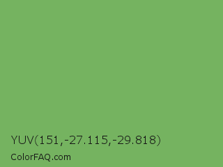 YUV 151,-27.115,-29.818 Color is a normal green color and the nearest color is Bud Green #7bb661. Hex code #75b360 and RGB value is rgb(117,179,96). In RGB color space, this color is composed of 46% red, 70% green, 38% blue, In CMYK color space, this color is composed of 35% cyan, 0% magenta, 46% yellow , 30% black , In HSL color space, this color has a hue angle of 105° , 35% saturation and 54% lightness.