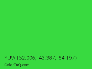 YUV 152.006,-43.387,-84.197 Color is a normal green color and the nearest color is Lime Green #32cd32. Hex code #38da40 and RGB value is rgb(56,218,64). In RGB color space, this color is composed of 22% red, 85% green, 25% blue, In CMYK color space, this color is composed of 74% cyan, 0% magenta, 71% yellow , 15% black , In HSL color space, this color has a hue angle of 123° , 69% saturation and 54% lightness.